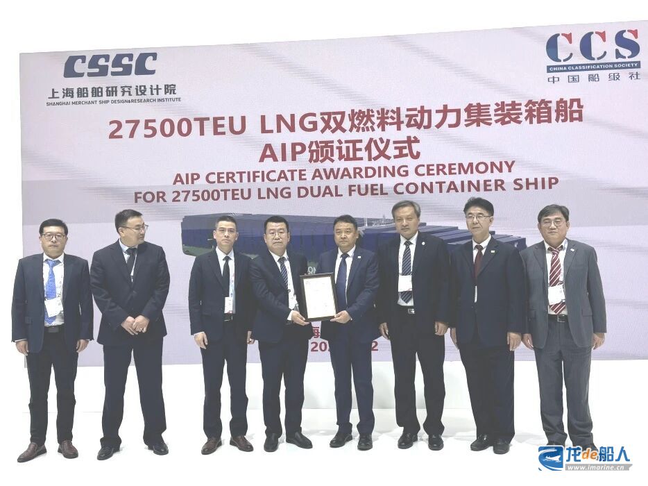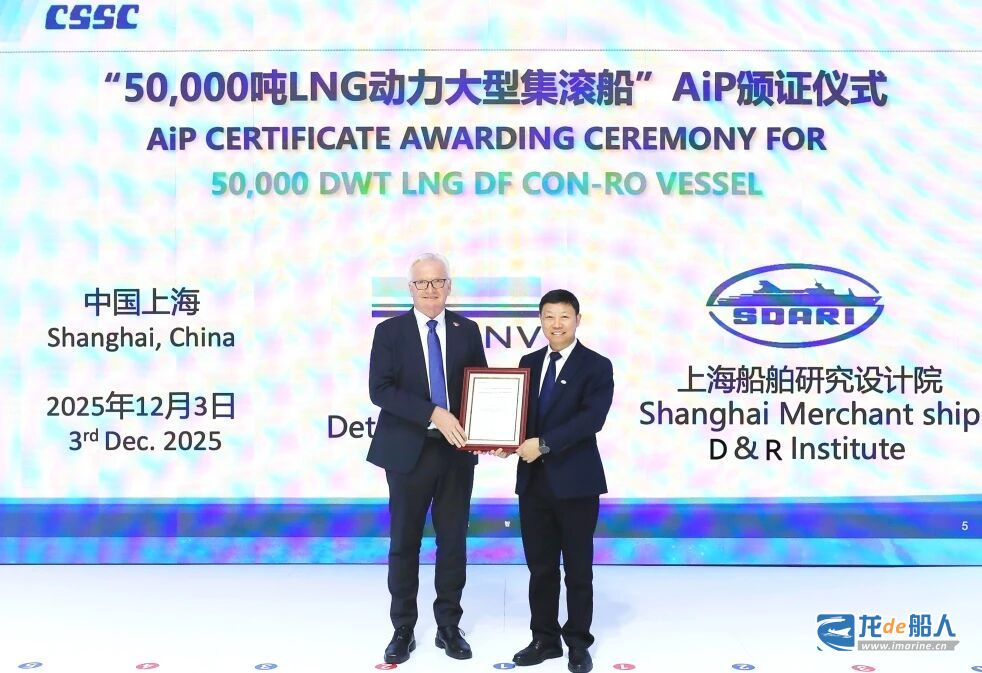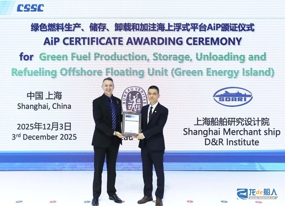 在 2025 中国国际海事会展(Marintec China 2025)上,中船集团上海船舶研究设计院(SDARI)自主研发的三大船型——27500箱超大型绿色双燃料集装箱船绿色燃料生产、储存、卸载和加注海上浮式平台(绿色能源岛)50000吨LNG动力集滚船获得来自三大船级社颁发的原则性认可(AiP)证书。