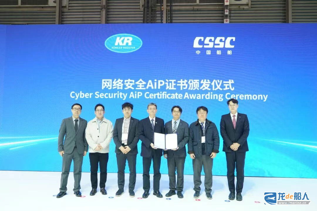 12月5日,在2025年中国国际海事技术学术会议和展览会上,中船广船国际正式获韩国船级社(KR)在中国颁发的首张船舶网络安全AIP原则性认可证书。韩国船级社中国审图中心总经理李光日、机电产品部总经理尹大赫,广船国际副总经理金利潮共同出席证书颁发仪式。