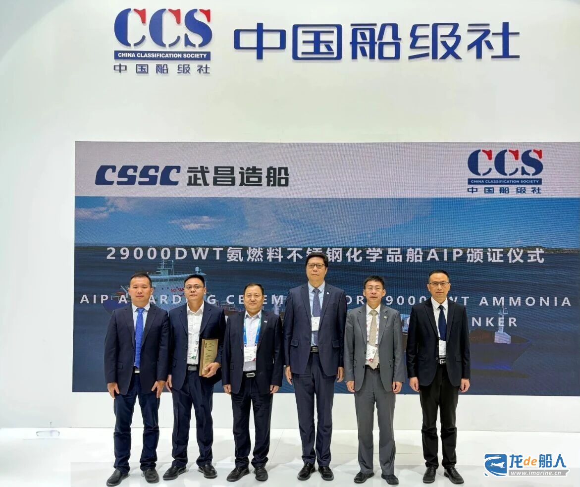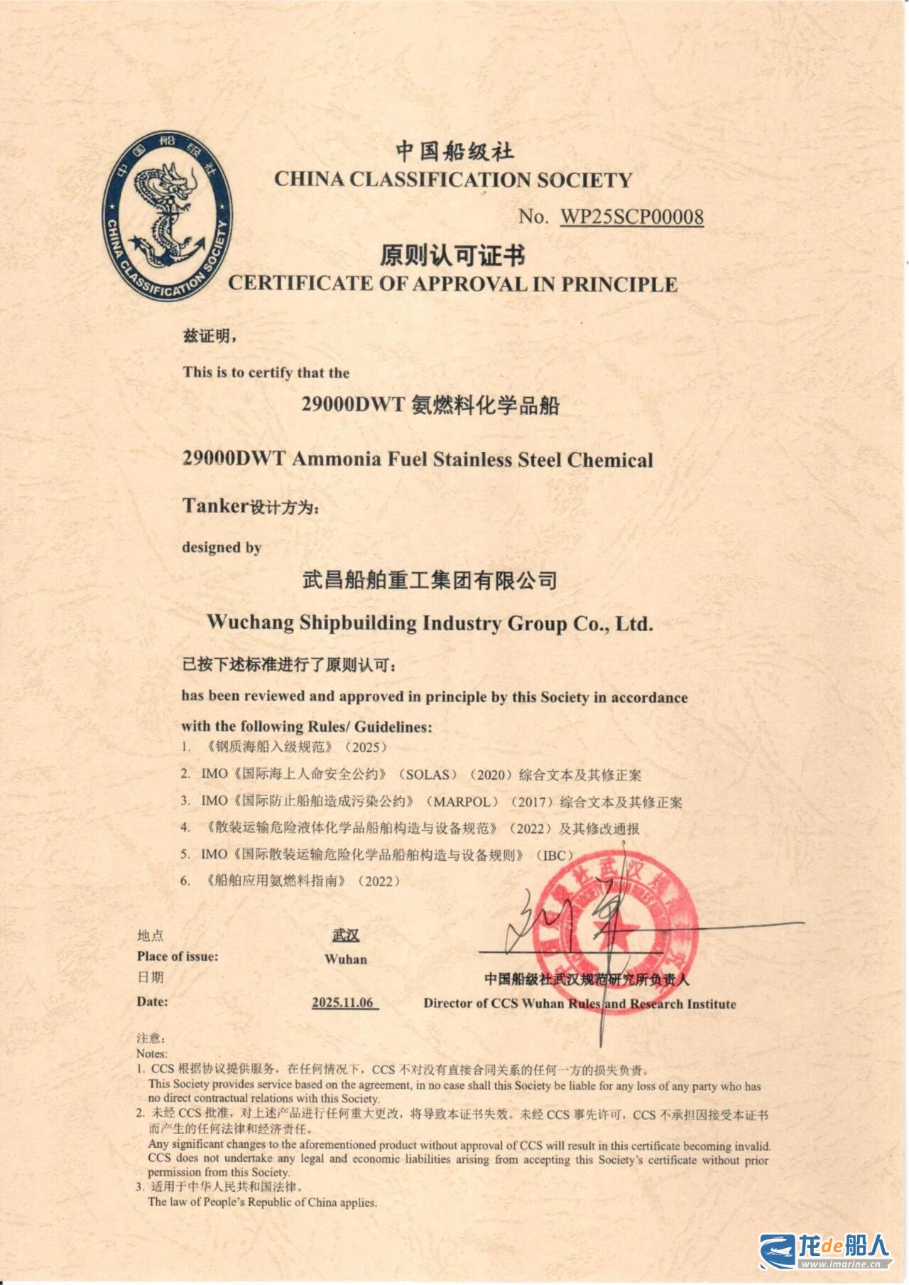 12月4日,在2025年中国国际海事展览会上,由中船集团武昌造船自主研发的29000DWT氨燃料双相不锈钢化学品船,成功获得中国船级社(CCS)颁发的原则性认可证书(AIP)。这一重要成果,标志着自主研发的零碳排放化学品船正式通过权威认证,为航运业绿色转型注入强劲动力。