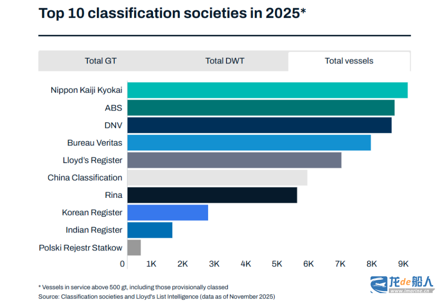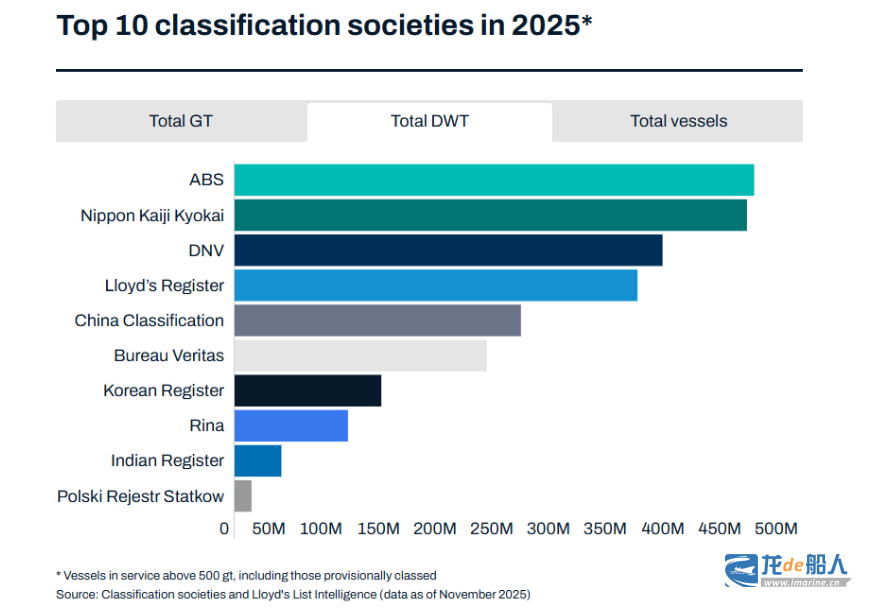 - 从入级总载重吨,2025年十大船级社排名为: