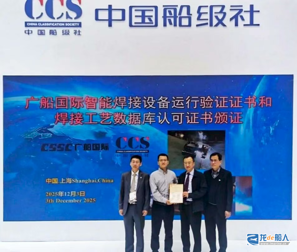 12月3日,2025中国国际海事会展期间,中船广船国际的3套智能焊接装备及相应的焊接工艺数据库荣获CCS船级社颁发的认可证书,是国内首个获得CCS智能焊接装备应用认证的造船企业。