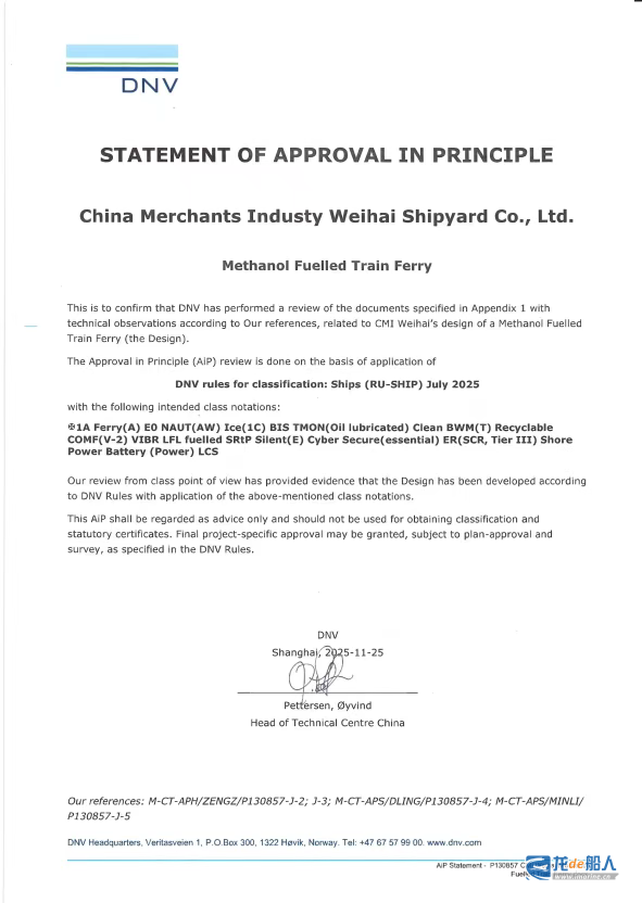 招商船舶工业威海船厂“甲醇燃料火车渡轮”设计获DNV船级社AIP证书