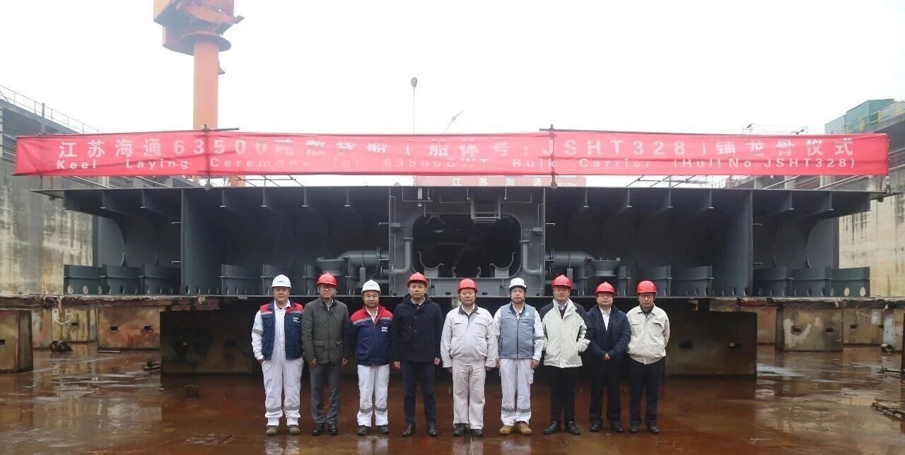 海通海洋一艘63500吨散货船举行铺龙骨仪式 来源:龙de船人 2025-12-14 8:26 12月13日上午,由海通海洋承建的一艘63500吨散货船(船体号:JSHT328)举行铺龙骨仪式,正式进坞搭载。 据悉,该船总长199.9m,型宽32.26m,型深18.9m,结构吃水13.5m,入级LR船级社。 本站文章如未标明来源,均为本站编译、编辑或原创文章,转载请注明来自“龙de船人”,违者必究。