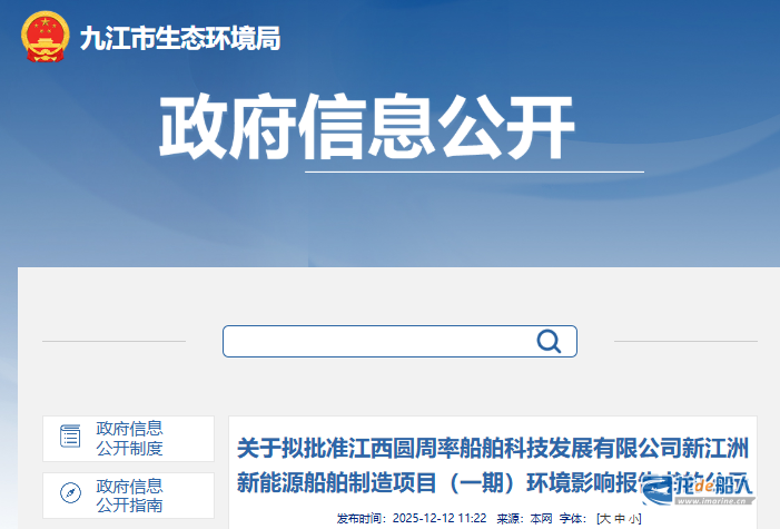 近日,江西省九江市生态环境局发布《关于拟批准江西圆周率船舶科技发展有限公司新江洲新能源船舶制造项目(一期)环境影响报告书的公示》。