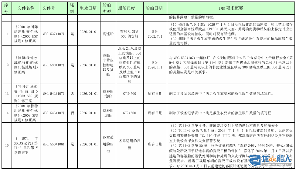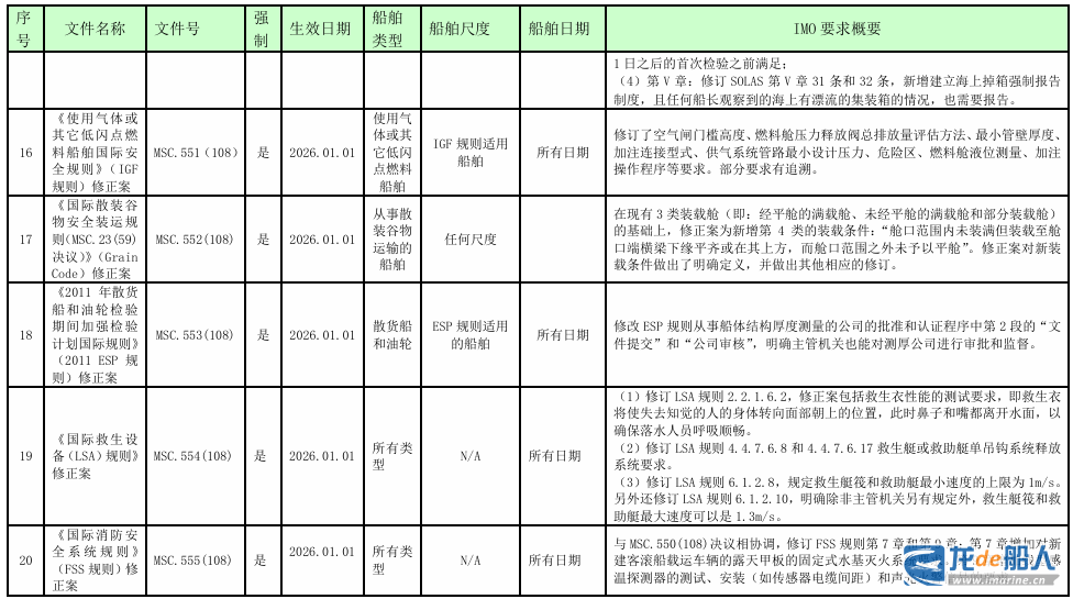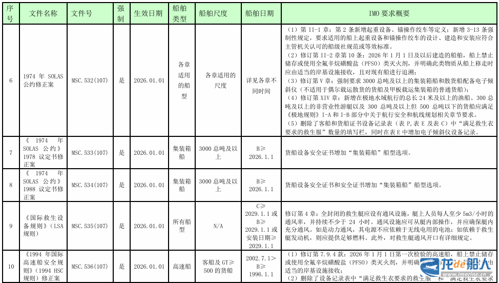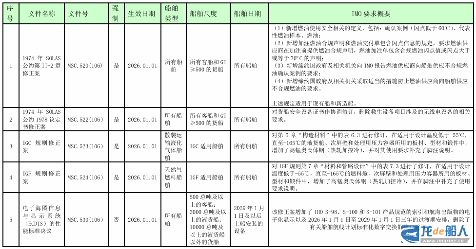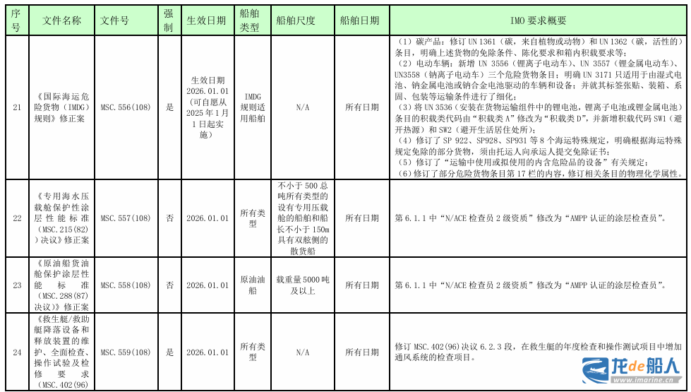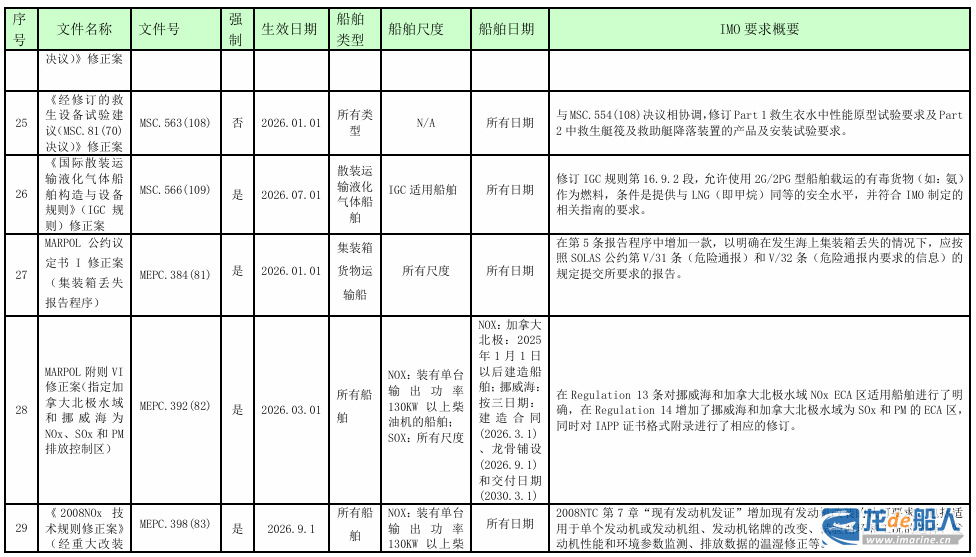 2026年生效的IMO强制性文件清单 来源:龙de船人 2025-12-27 10:22 2026年1月1日至12月31日生效的国际海事组织(IMO)文件共计清单29项,涉及SOLAS公约、MARPOL公约和相关规则的修正案,均属强制性文件或类强制性文件。 来源:CCS 本站文章如未标明来源,均为本站编译、编辑或原创文章,转载请注明来自“龙de船人”,违者必究。