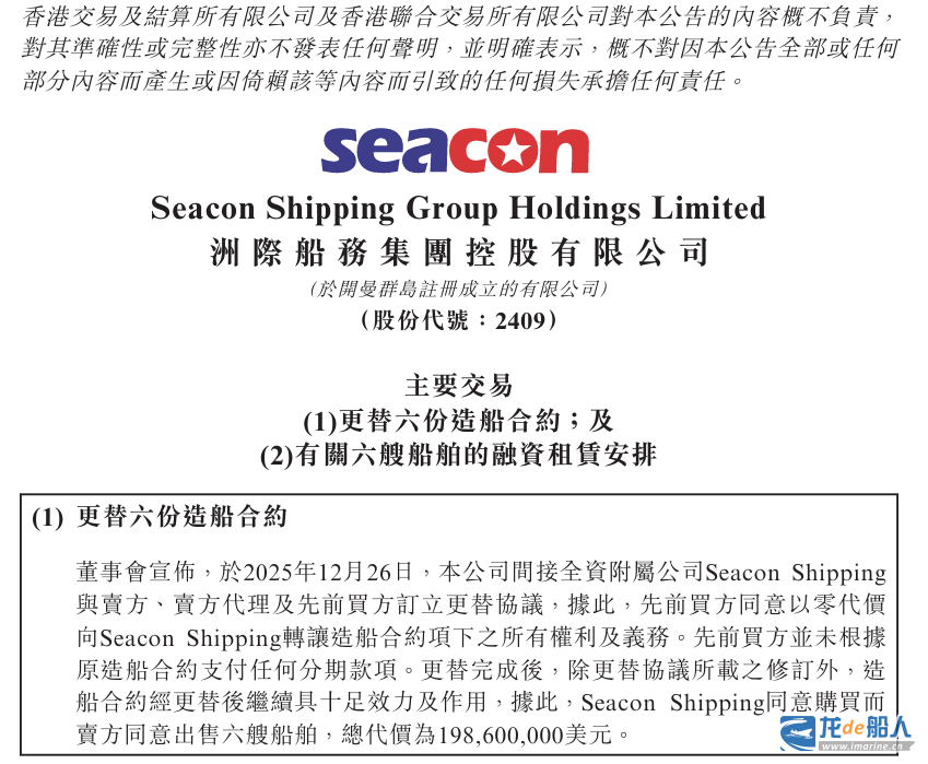 公告披露,2025年12月26日,洲际船务间接全资附属公司Seacon Shipping 与卖方、卖方代理及先前买方订立更替协议,据此,先前买方同意以零代价向Seacon Shipping转让造船合约项下的所有权利及义务。先前买方并未根据原造船合约支付任何分期款项。更替完成后,除更替协议所载的修订外,造船合约经更替后继续具十足效力及作用,据此,Seacon Shipping同意购买而卖方同意出售六艘船舶,总代价为1.986亿美元(约合人民币13.9亿元),单船造价3310万美元。