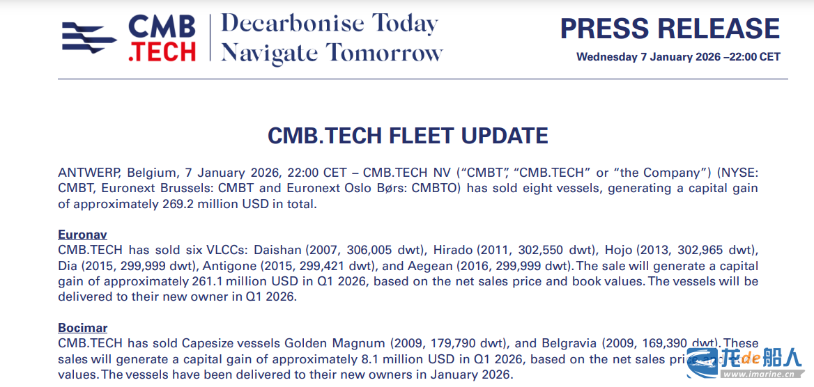 CMB.TECH表示,根据净销售价格与账面价值的对比,上述6艘VLCC预计将于2026年第一季度交付新船东,此次出售预计将带来约2.611亿美元资本收益。