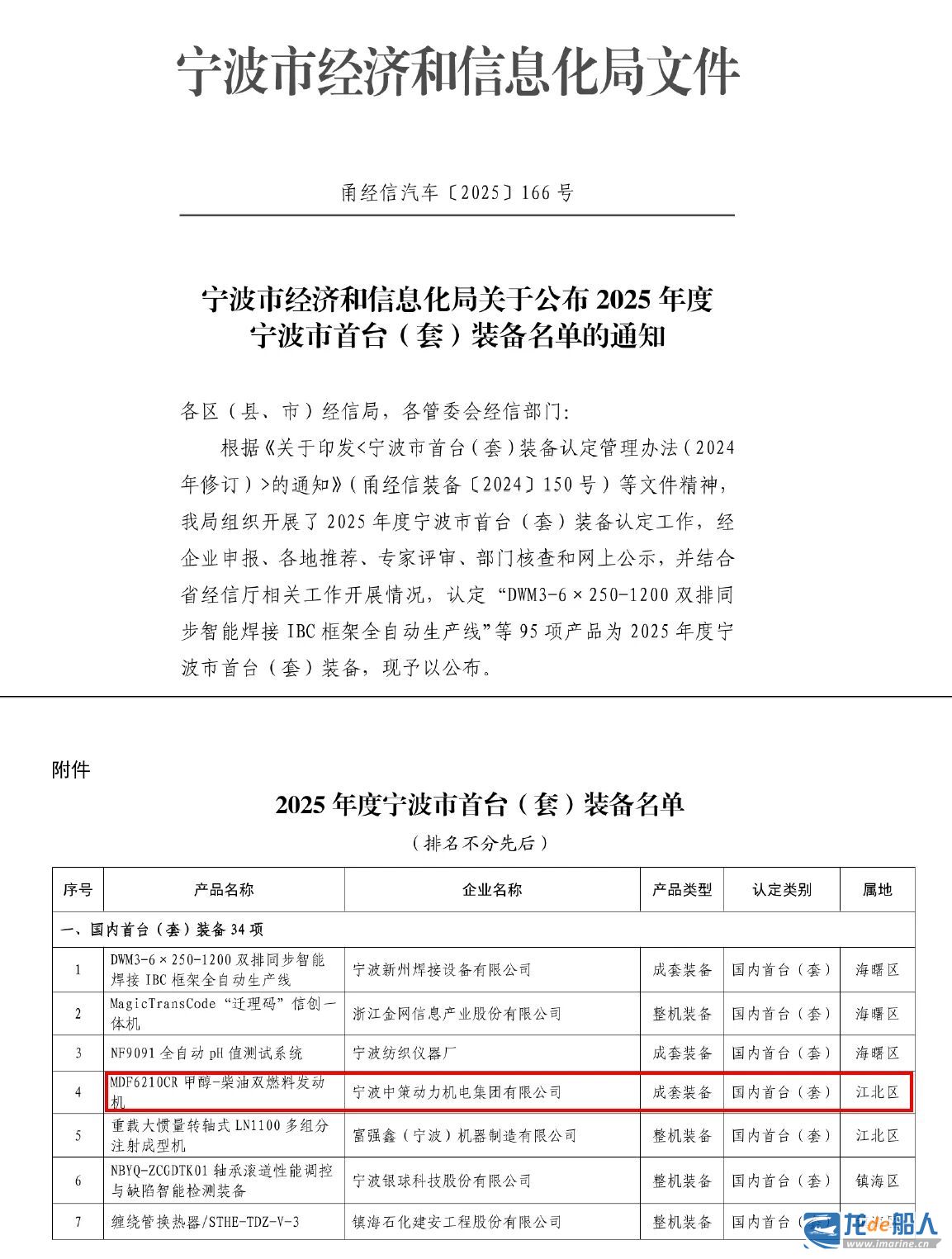 2025年12月24日,宁波市经济和信息化局公示2025年度宁波市高端装备制造业重点领域首台(套)产品,中策集团“MDF6210CR甲醇-柴油双燃料发动机”成功获得国内首台(套)认证