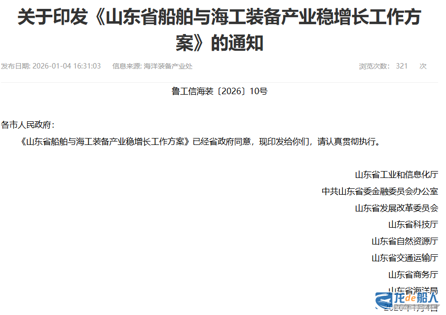 近日,山东省工业和信息化厅等八部门印发《山东省船舶与海工装备产业稳增长工作方案》,提出到2026年年底,新能源船舶、高端海工装备等新增长点快速发展,产业营收规模增速达到10%以上,新能源动力船舶建造完工量、新接订单量、手持订单量比重均保持60%以上,交付一批有重要影响力的“大国重器”