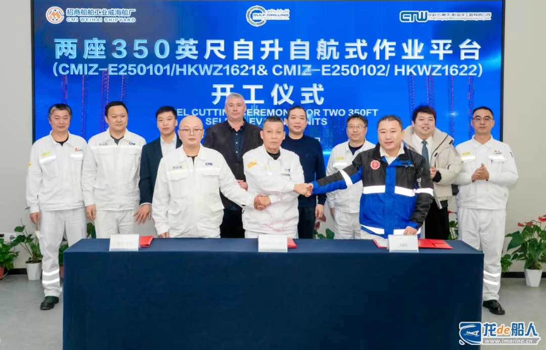 1月16日,招商船舶威海船厂为华科五洲(天津)海洋工程有限公司建造的两座自升自航式作业平台开工。华科五洲(天津)海洋工程有限公司董事长黄雪飞、总经理贾国兴,公司领导参加开工仪式。