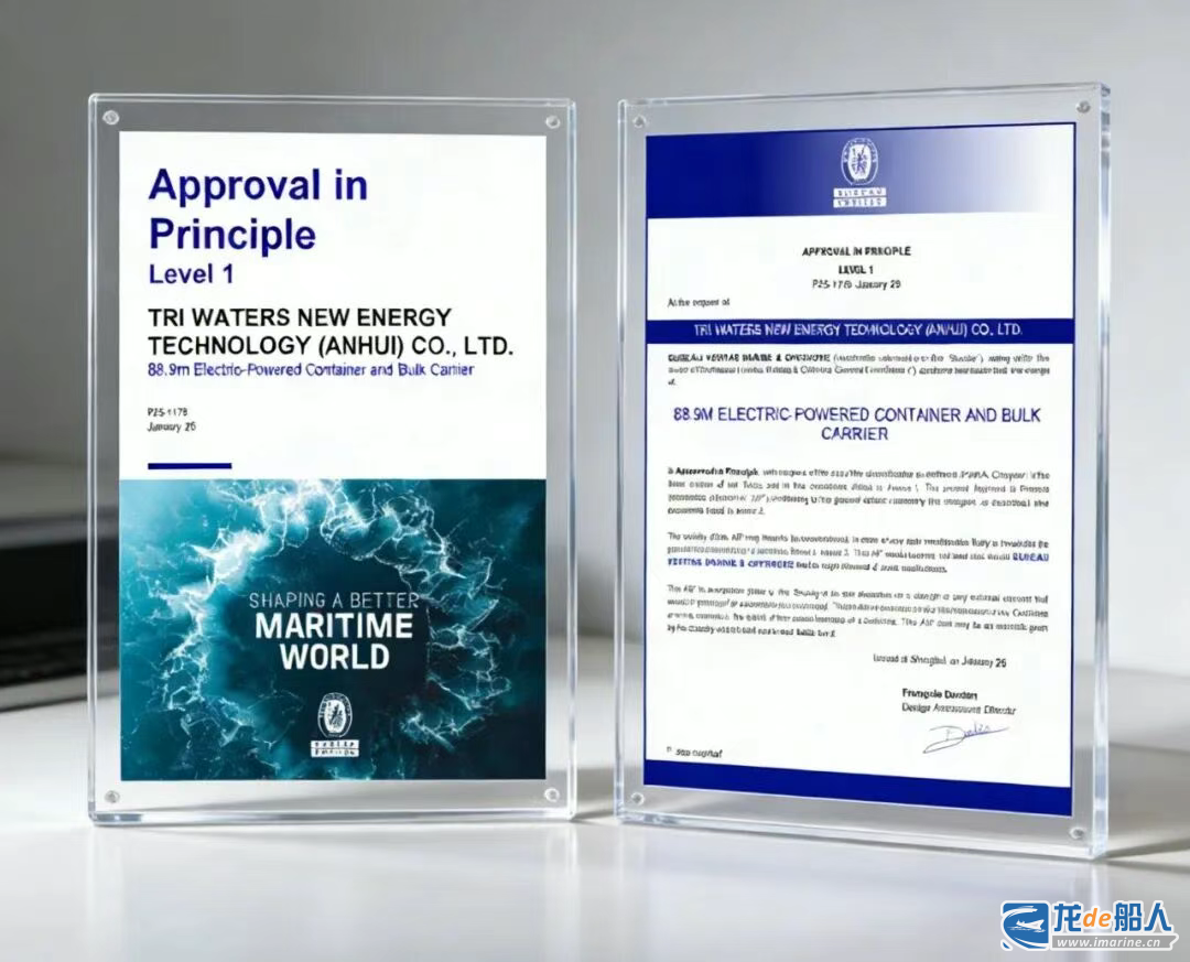 近日,三点水新能源科技有限公司再添重磅硕果 —— 其自主研发的 88.9 米电动集装箱散货两用船 “河豚蔚蓝 02”,成功斩获法国船级社(“BV”)颁发的原则性认可(“AIP”)证书。