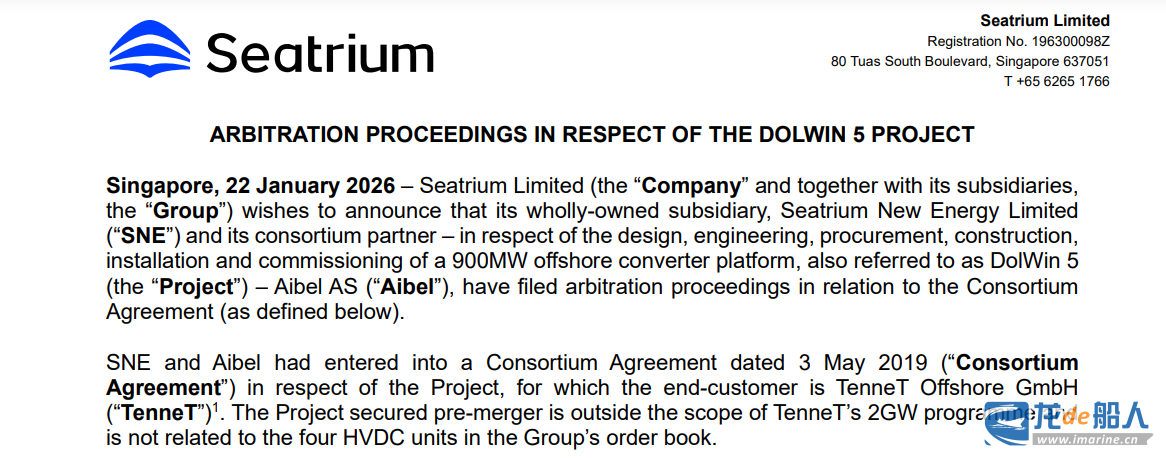1月22日,海庭通过官网发布声明,旗下全资子公司Seatrium New Energy与其项目合作伙伴Aibel,已就合作项目——900MW海上换流站平台(DolWin 5项目)的设计、工程、采购、施工、安装及调试(EPCIC)相关事宜互相提起仲裁程序。