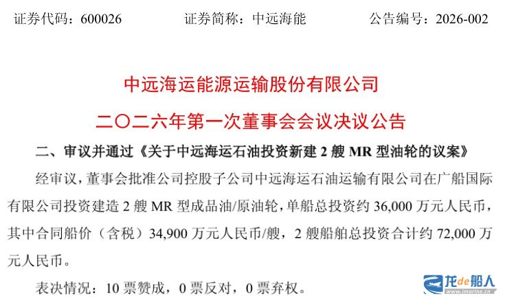 1月26日晚间,中远海运能源运输股份有限公司(中远海能)发布《二〇二六年第一次董事会会议决议公告》,会上审批通过《关于中远海运石油投资新建2艘MR型油轮的议案》。