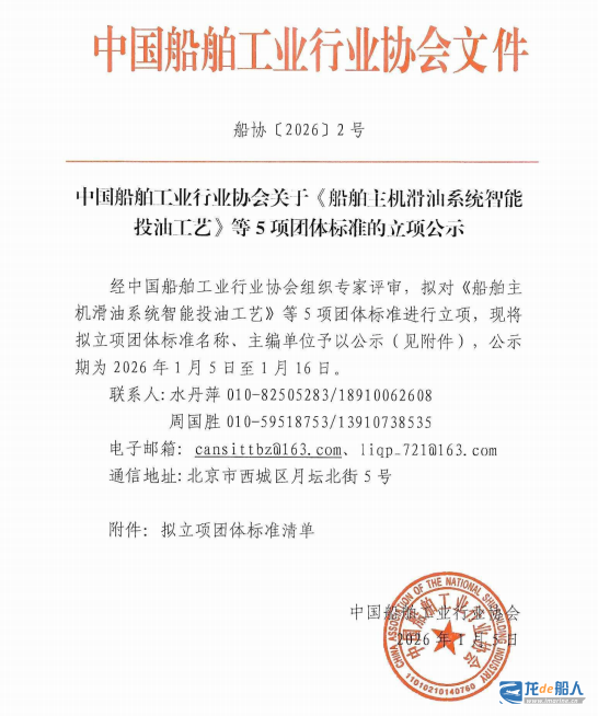 中国船协发布5项团体标准立项公示 来源:龙de船人 2026-02-02 10:47 日前,中国船舶工业行业协会发布关于《船舶主机滑油系统智能投油工艺》等5项团体标准的立项公示。 具体如下: 来源:中国船舶工业行业协会 本站文章如未标明来源,均为本站编译、编辑或原创文章,转载请注明来自“龙de船人”,违者必究。