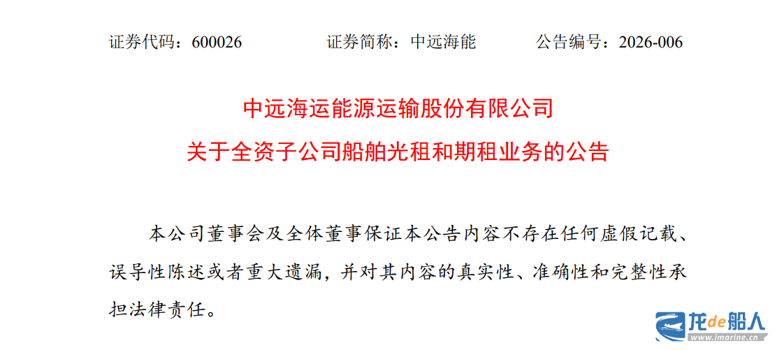 1月30日晚间,中远海运能源运输股份有限公司(以下简称“中远海能”)发布《关于全资子公司船舶光租和期租业务的公告》。