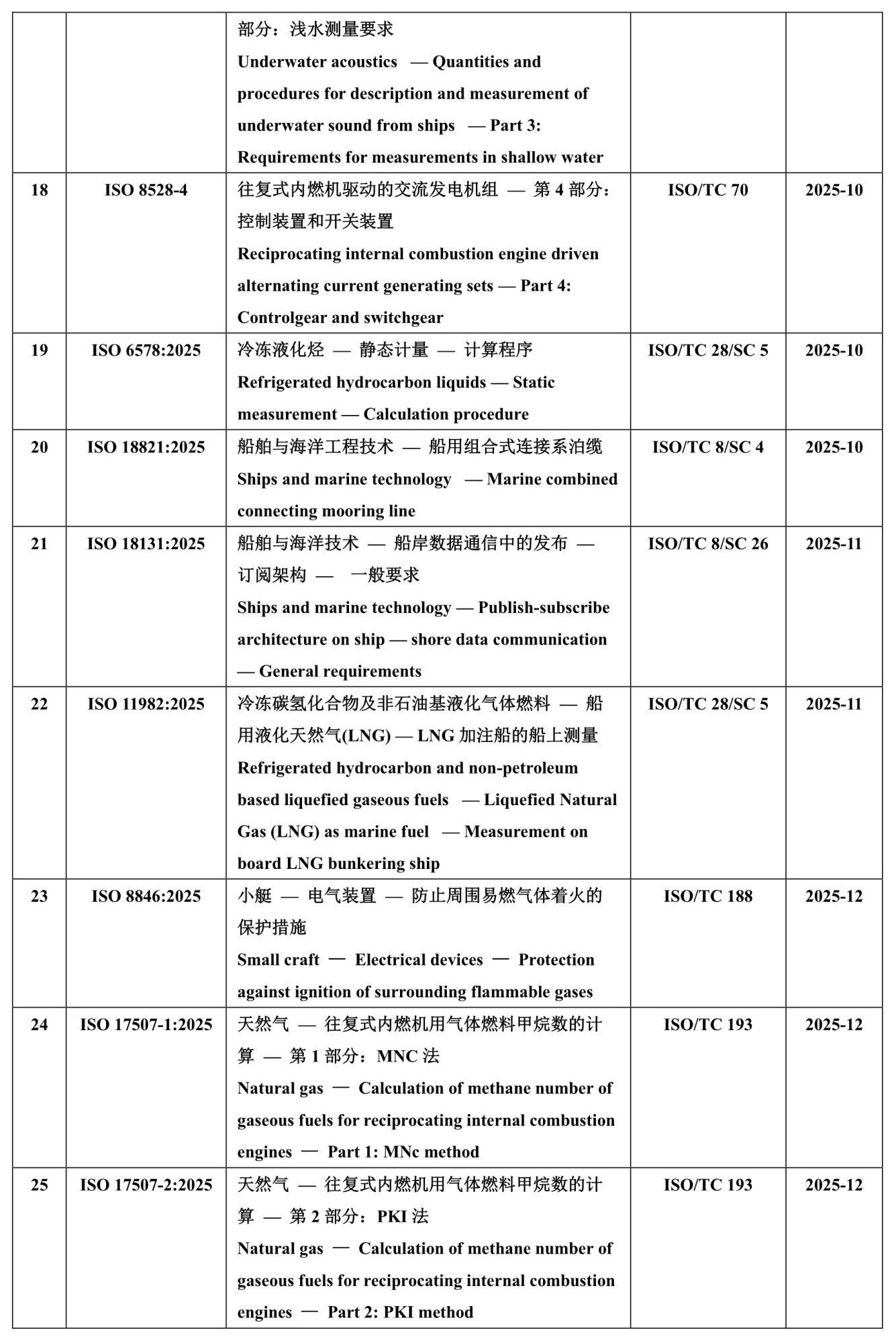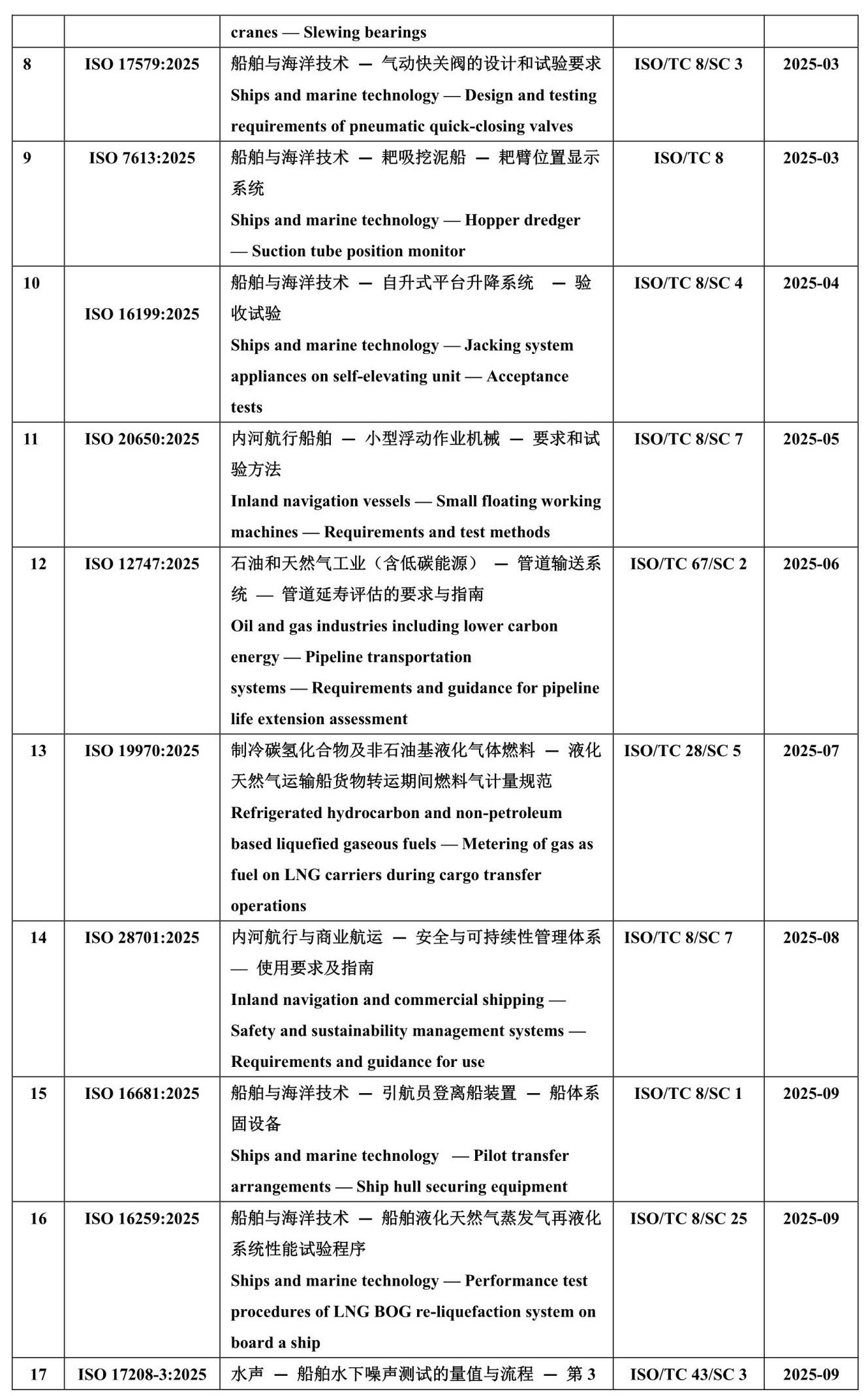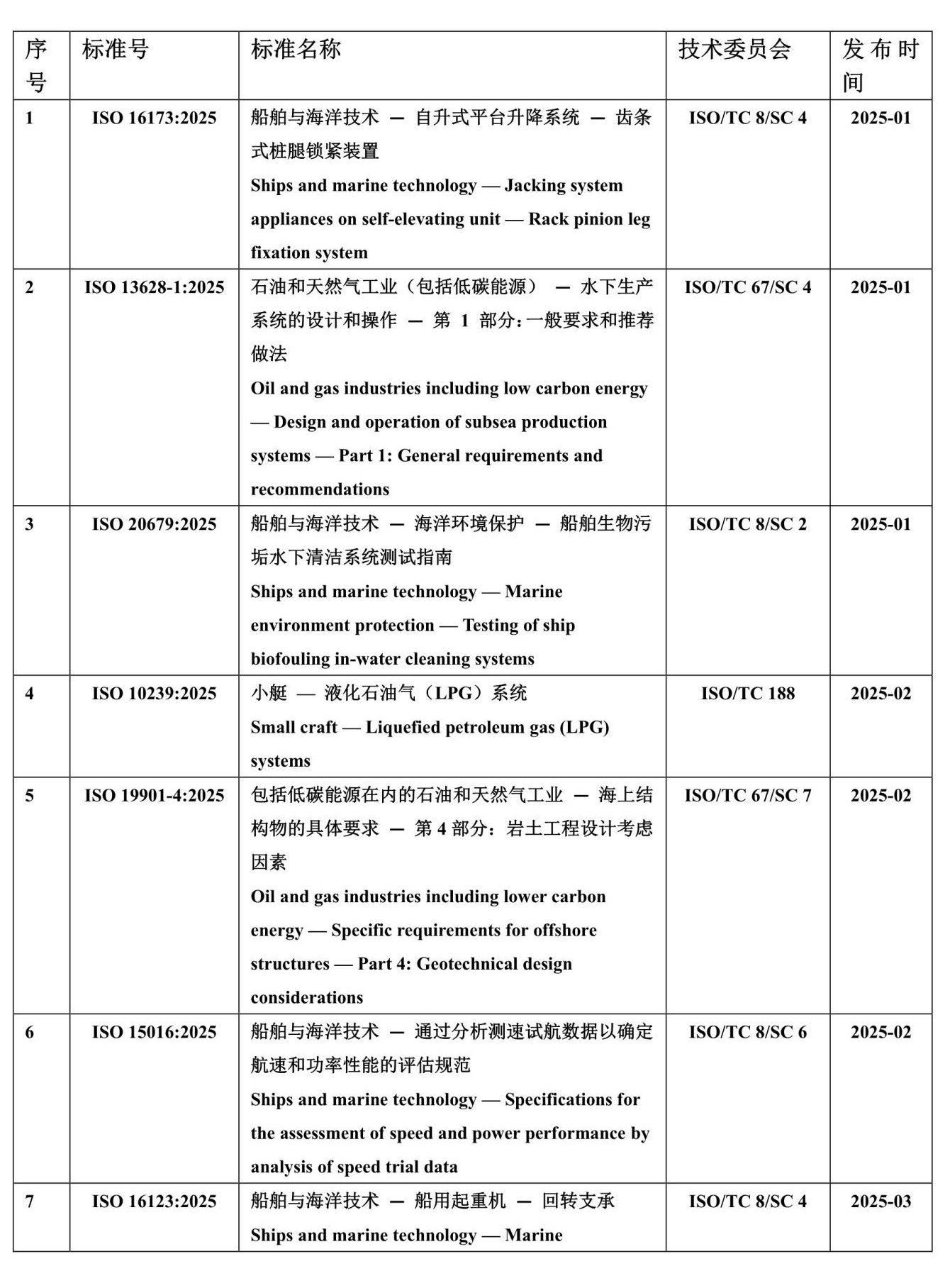2025年,ISO发布船海国际标准汇总 来源:龙de船人 2026-02-02 11:53 据统计,2025年度,在船舶与海洋领域ISO共发布25项国际标准,涉及自升式平台升降系统、船用配件、液化气等领域,详见下表。 2025年船海领域新发布ISO国际标准汇总 本站文章如未标明来源,均为本站编译、编辑或原创文章,转载请注明来自“龙de船人”,违者必究。