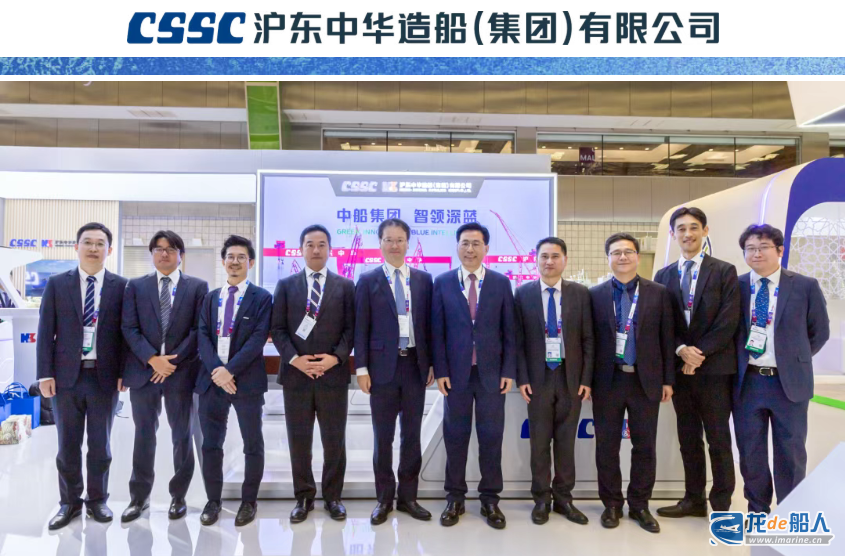 中船集团党组成员、副总经理彭原璞参加沪东中华新船发布。沪东中华党委书记、董事长陈建良,总工程师宋炜等领导来到展台,与来自全球的能源巨头、知名船东及行业伙伴深度交流,为各方来宾细致解读未来型产品的设计理念、核心技术优势与低碳创新成果,全方位展现该公司在 LNG 船、清洁能源运输船等高端船型领域的研发实力与建造水平。