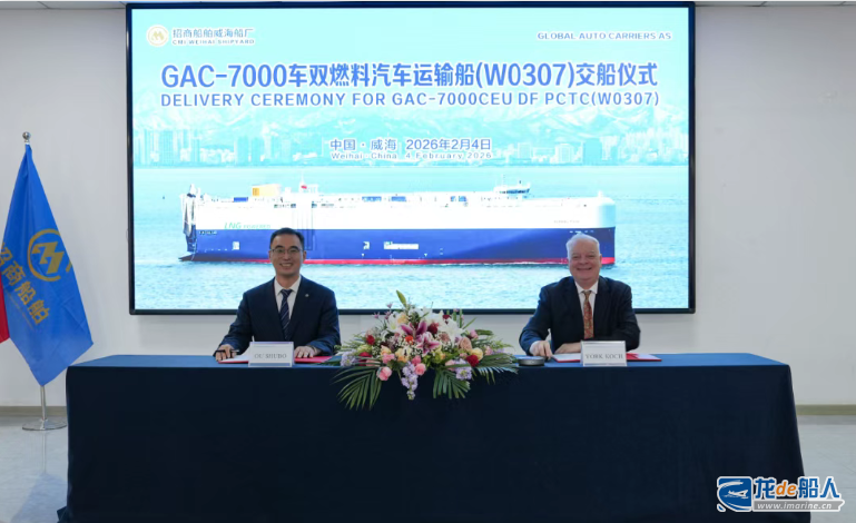 2月4日,招商船舶威海船厂为GAC船东建造的第二艘7000车双燃料汽车运输船“GLOBAL FUJI”(W0307)完工交付。