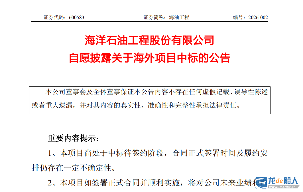 2月13日晚间,海洋石油工程股份有限公司(以下简称“海油工程”或“公司”)发布《自愿披露关于海外项目中标》的公告。