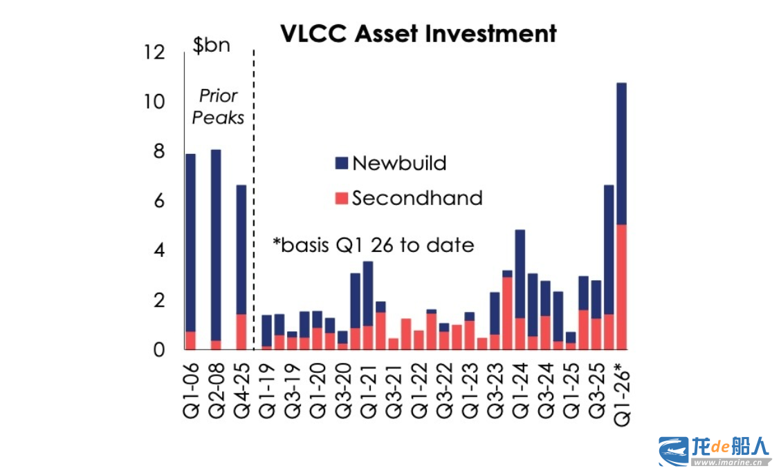 在韩国老牌船东长锦商船(Sinokor Merchant Marine)史无前例的VLCC船队扩张计划推动下,2026年的VLCC资产投资总额(二手+新船)已突破100亿美元,创下该船型市场季度投资纪录新高。
