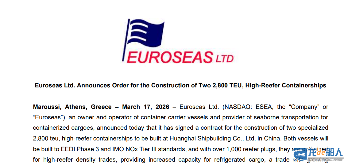 3月17日,希腊支线集装箱船东Euroseas通过官网宣布,该公司已与黄海造船签订2艘2800TEU冷藏集装箱船建造合同,预计将于2028年6月和8月交付。