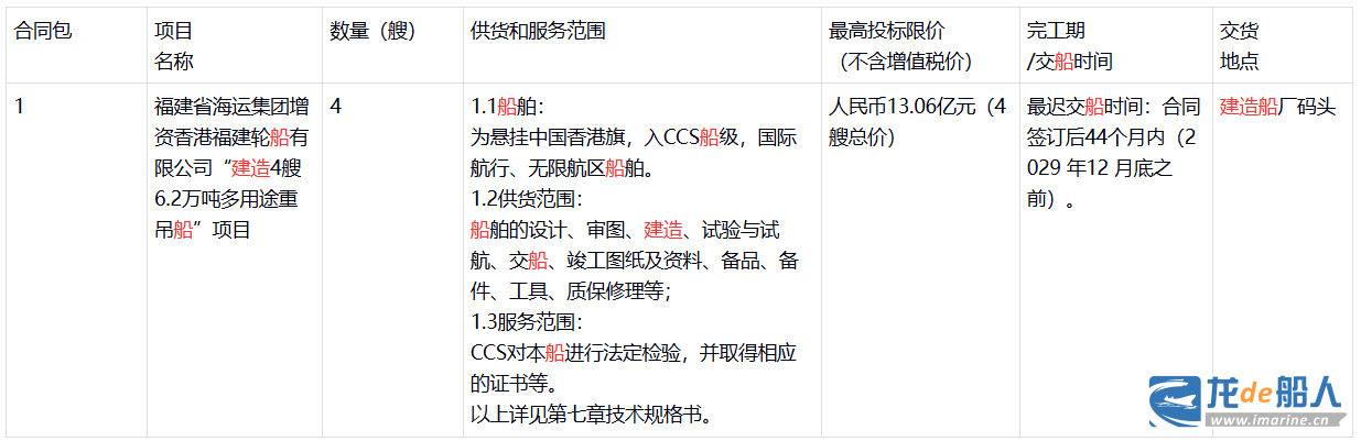 福建省海运集团增资香港福建轮船有限公司“建造4艘6.2万吨多用途重吊船”项目标段招标公告