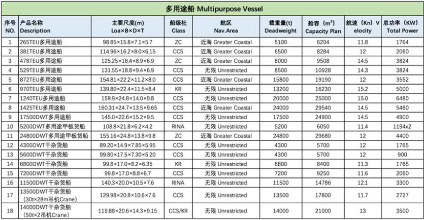 宁波东方船舶设计院在MPP领域的核心船型已形成覆盖 4300DWT 至 62000DWT 的完整系列。在满足最新公约规范的前提下,设计上强调 “钢料省、油耗低、运营维护成本低”的三大原则,船体线型经过优化,力求在保证航速的同时降低燃油消耗,以下是部分中小型MPP船型的技术参数: