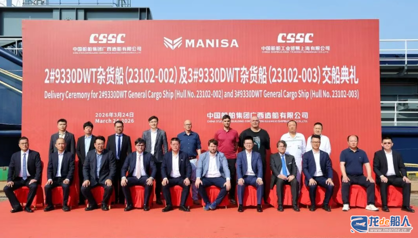 3月24日,中船广西公司联合中国船舶工业贸易上海有限公司,与意大利MANISA公司举行9330DWT散杂货船2号“MANISA BIANCANEVE”船和3号“MANISA AURORA”船交船仪式,三方代表在广西钦州签署交船文件,标志该系列船型第二艘及第三艘新造船舶正式交付。