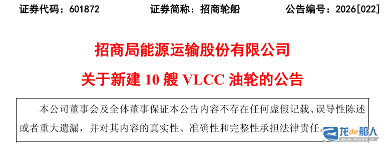 招商轮船表示,该公司于2026年3月25日召开的第七届董事会第二十七次会议审议通过了《关于新建VLCC油轮的议案》,董事会同意公司在中国船舶工业股份有限公司(中国船舶)旗下一线船厂新建10艘VLCC油轮。