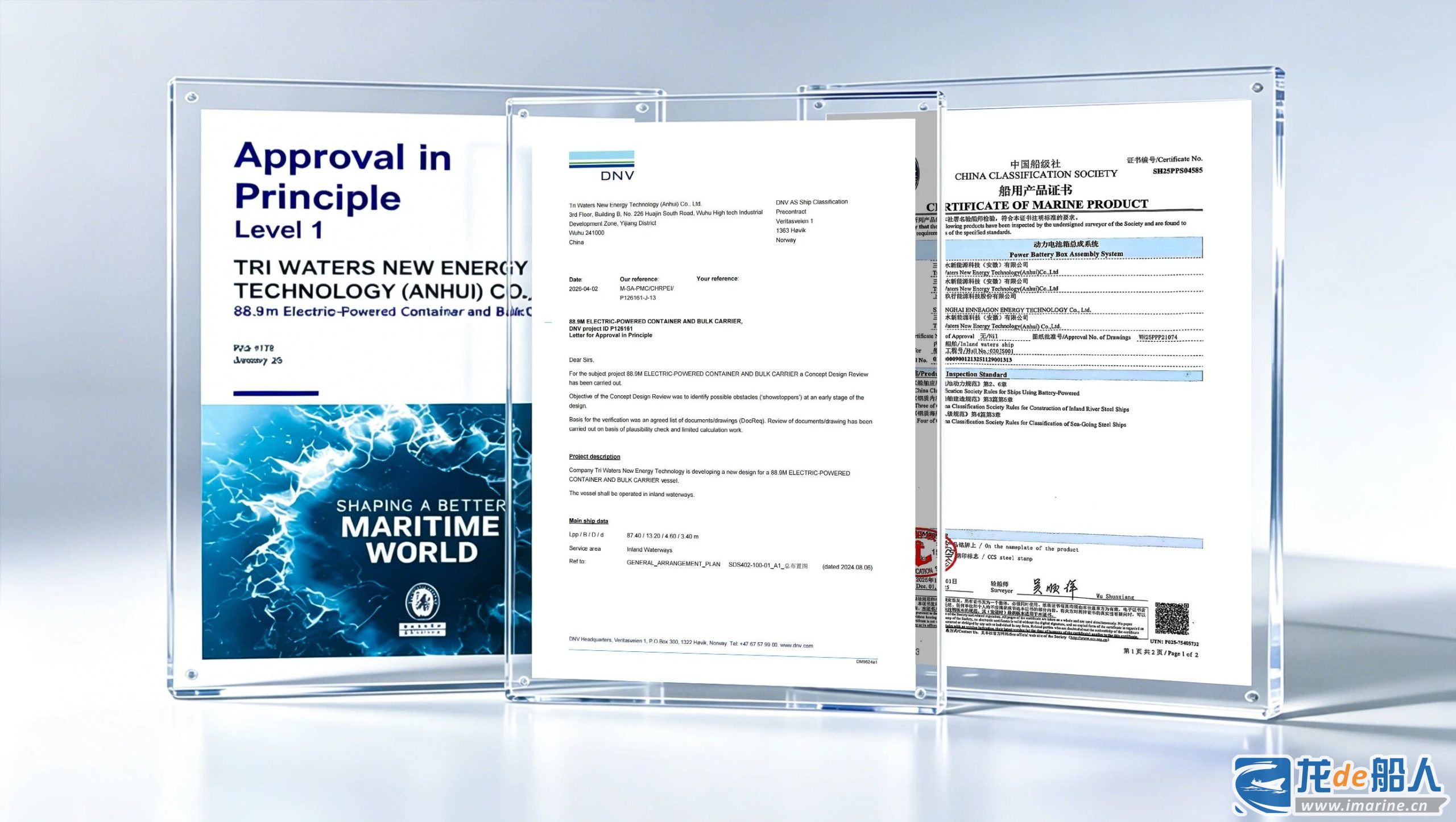 三点水新能源科技有限公司宣布,近日,该公司自主研发的88.9米电动集装箱散货两用船——河豚蔚蓝02,继斩获法国船级社(BV)原则性认可(AIP)证书后,再度拿下挪威船级社(DNV)颁发的AIP认证。至此,作为全球首制PACK换电船的河豚蔚蓝系列船型,已成功集齐全球三大权威船级社认可,标志着中国自主研发的内河绿色智能船舶技术,通过国内国际航运界顶级权威机构的全方位核验与高度肯定,为全球内河航运零碳转型树立起崭新标杆。