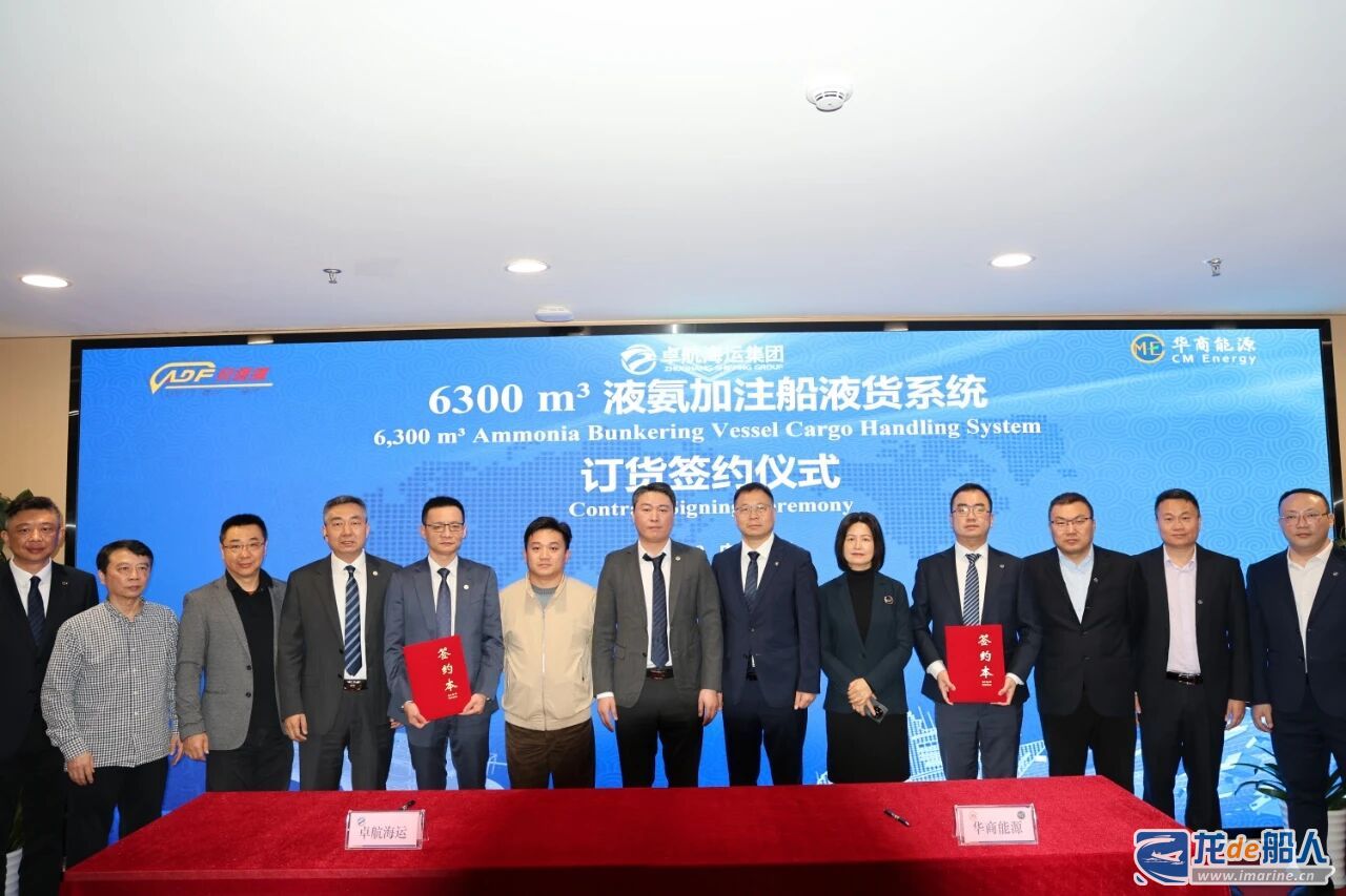 4月9日,华商天时海洋科技(江苏)集团有限公司与卓航海运集团股份有限公司正式签署6300m³液氨加注运输船液货系统项目合同。