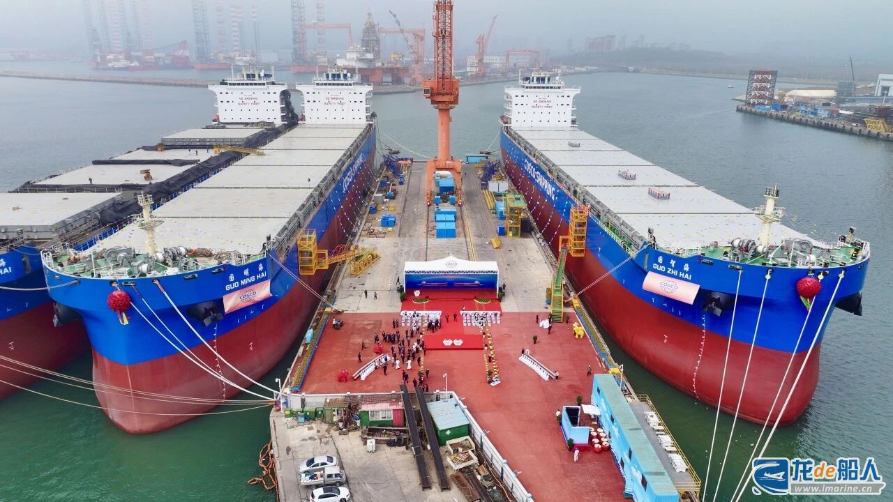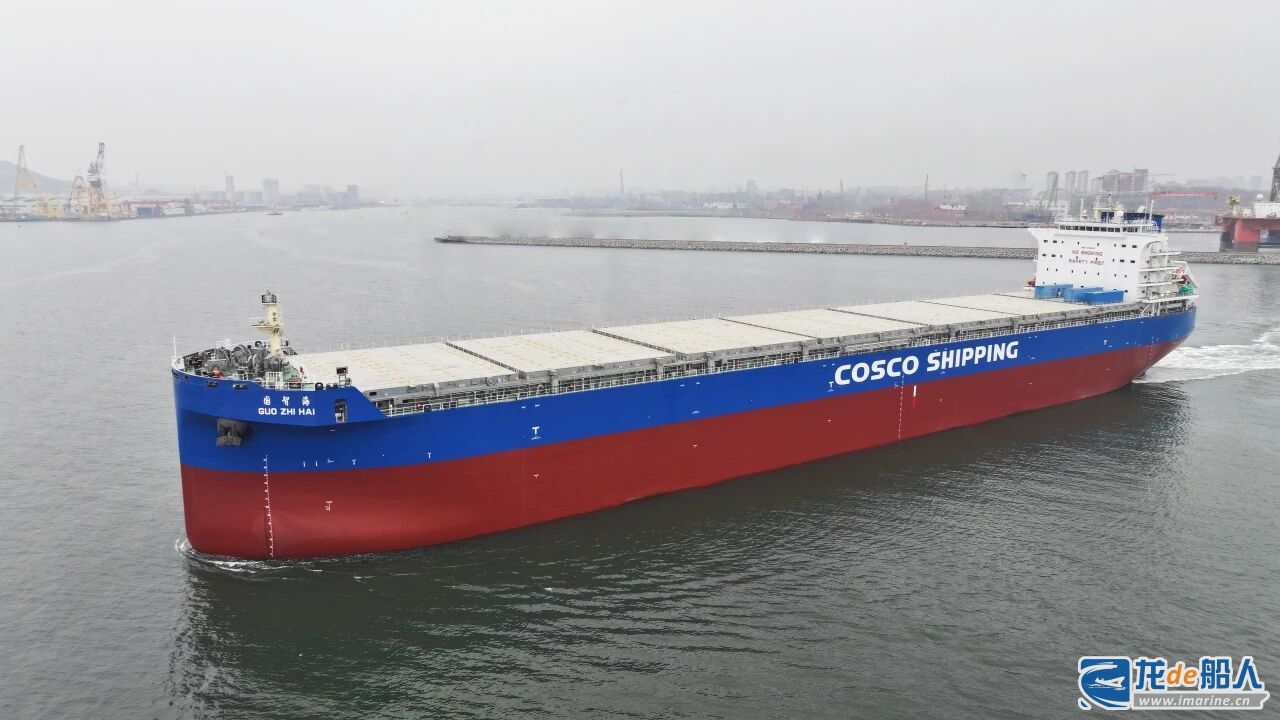 4月10日,大连中远海运重工迎来“双喜临门”,为中远海运发展建造的80000吨多用途粮食运输船第二艘“国智海”轮(N1258轮)交付命名,第三艘“国明海”轮(N1259)同步命名,两艘新船将陆续由中远海运散运承租并投入运营,开启远洋航运新征程。系列首制船“国韵海”轮于3月26日交付后。