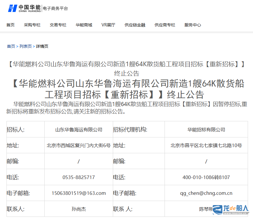 华能燃料公司山东华鲁海运有限公司新造1艘64K散货船工程项目招标【重新招标】因暂停招标,重新招标将重新发布招标公告,请关注新的招标公告。