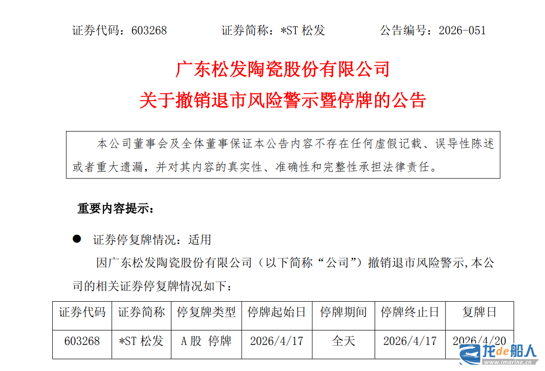 随着核心财务指标全面改善以及和会计师事务所出具的标准无保留意见审计报告,*ST松发股票触及退市风险警示的情形已消除,符合申请撤销股票退市风险警示的条件,且不存在触及其他退市风险警示和其他风险警示的情形。上海证券交易所于2026年4月16日同意*ST松发撤销退市风险警示。