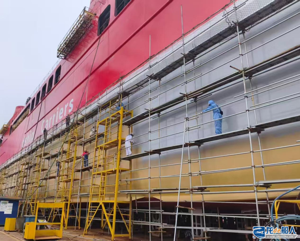 近日,南京金陵DC项目首制船有机硅喷涂施工圆满完成。南京金陵涂装部联合海虹油漆公司技术团队完成该船外壳高端特种防污漆涂装任务。