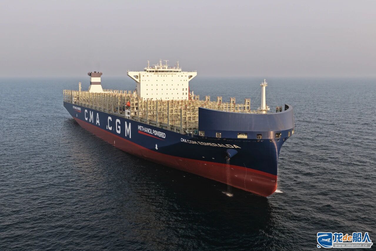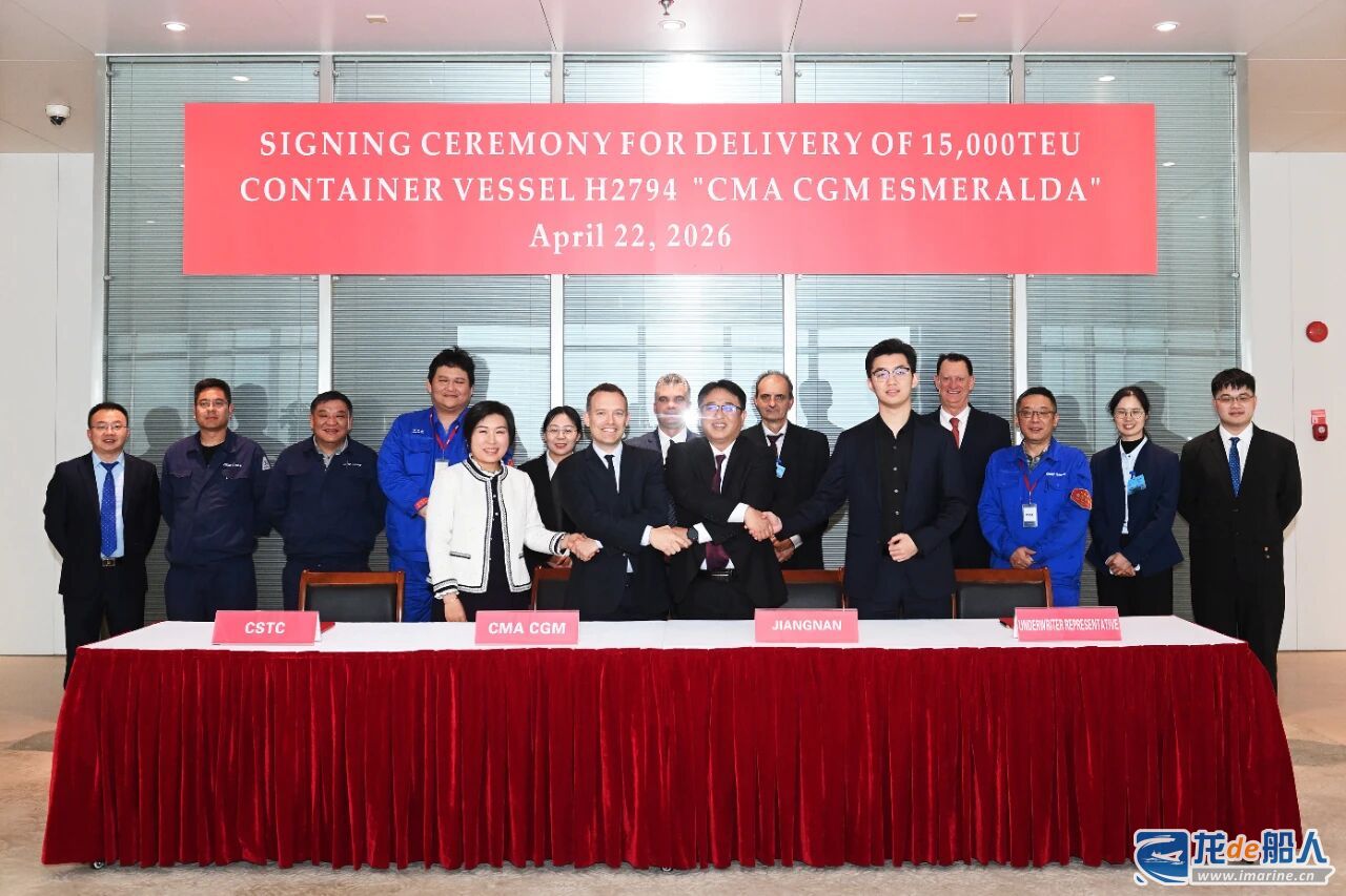 4月22日,中船旗下江南造船(集团)有限责任公司为达飞海运公司建造的“鲲”系列甲醇双燃料动力大型集装箱船系列船第四艘(H2794船)——“CMA CGM ESMERALDA”签字命名交付。