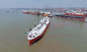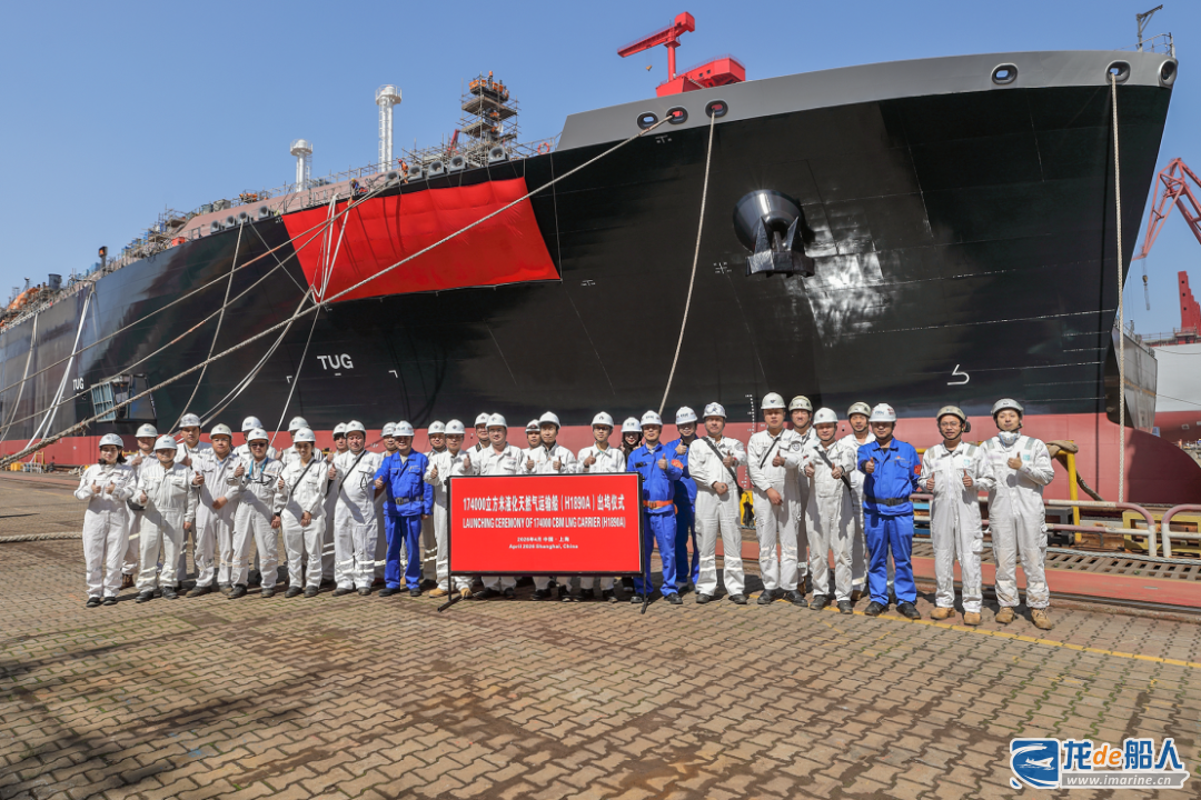 4月24日,沪东中华为中海油重点项目建造的174000立方米LNG运输船(H1890A)在西部厂区Y2船坞提前6天出坞。