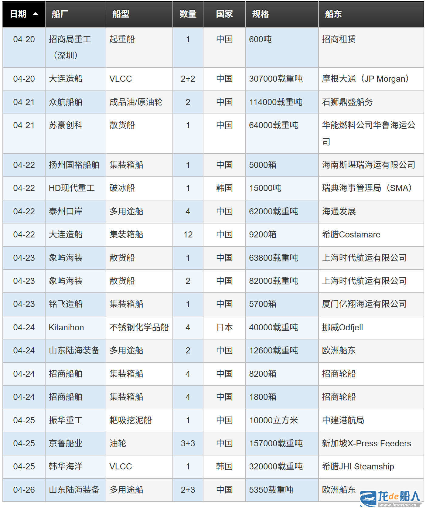 据龙船订单库跟踪统计,上周(4.20-4.26)公布的订单数量为49+8艘。