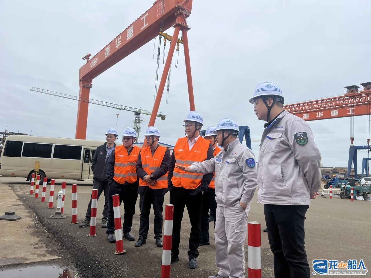 赵龙一行先后走进船台、船坞、生产加工车间,实地查看船体分段建造、船台施工周期、施工队伍配置等资源落实情况,专项检查自主研发“同心双缆盘”的生产制造进度。