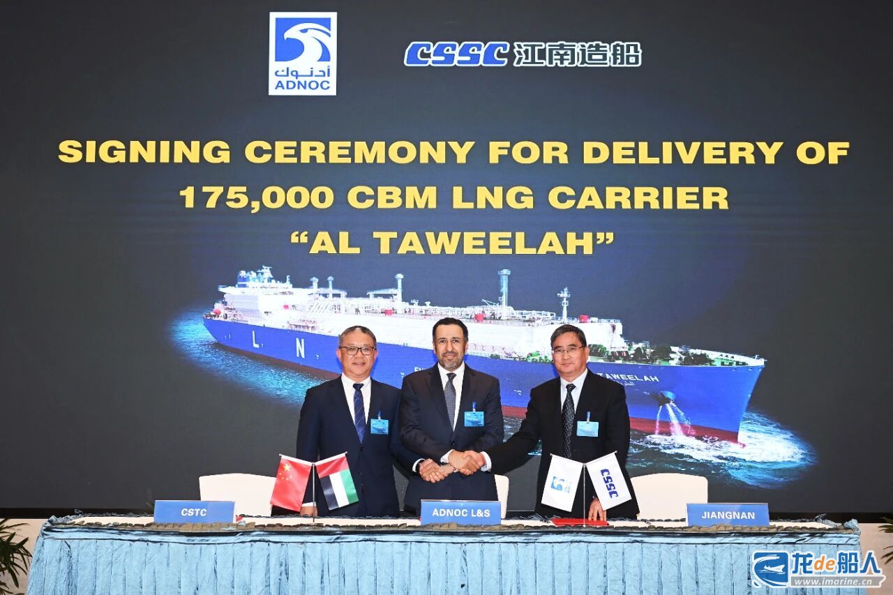 4月23日,中船江南造船为阿布扎比国家石油公司(ADNOC)旗下ADNOC Logistics & Services(简称ADNOC L&S)建造的17.5万立方米大型Mark Ⅲ Flex薄膜式LNG运输船系列船最后一艘——“AL TAWEELAH”(H2705船)签字命名交付,该船提前7个月交付,标志着中国首个大型Mark Ⅲ Flex薄膜式LNG运输船项目圆满收官。