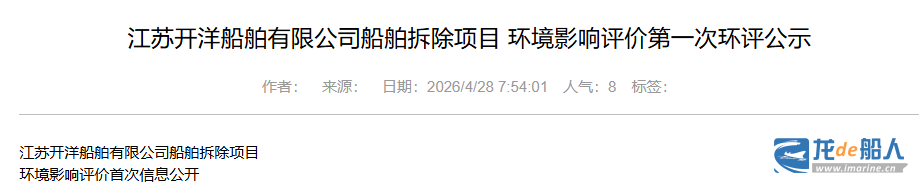 4月28日,江苏开洋船舶科技有限公司(下称“开洋船厂”)正式发布《船舶拆除项目 环境影响评价第一次环评公示》,标志着该公司在新能源船舶制造基地落地后,拓展船舶拆解业务,打造“制造+拆解”双向赋能的绿色航运产业链。