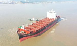 11月15日,中国船舶集团旗下上海外高桥造船有限公司为台湾TSLines公司建造的7000TEU集装箱船系列船型第三艘船H1559船、为加拿...