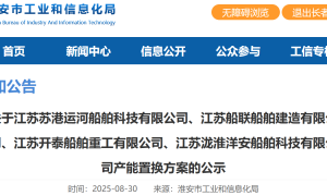 8月30日,淮安市工业和信息化局发布《关于江苏苏港运河船舶科技有限公司、江苏船联船舶建造有限公司、江苏开泰船舶重工有限公司、江苏泷淮洋安船舶...