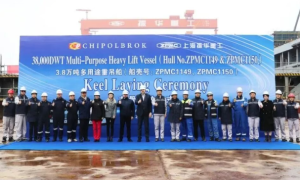 3月18日,上海振华重工集团为中波轮船股份公司建造的38000吨多用途重吊船(3#、4#船)铺龙骨仪式在振华海工顺利举行。 该型重吊船是上海...