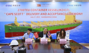 7月17日,中国船舶集团属下黄埔文冲船舶有限公司为Schoeller Holdings公司建造的2700箱系列集装箱船首制船“CAPE SC...