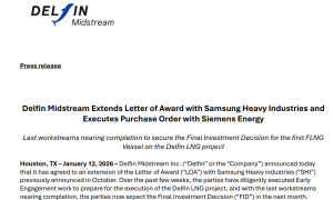 当地时间1月12日,Delfin Midstream通过官网宣布,该公司已同意延长此前于2025年10月与三星重工签订的授标函(LOA)。过...
