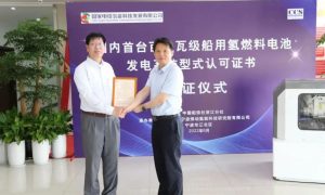 2022年6月15日,国内首台百千瓦级船用氢燃料电池发电系统型式认可证书颁发仪式在浙江宁波举行,中国船级社(CCS)为国家电投集团氢能科技发...