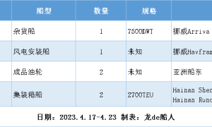 据龙船订单库(https://www.imarine.cn/order)统计,4月17日至4月23日报道的新船订单有9艘。
