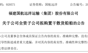 2月5日晚间,福建国航远洋运输(集团)股份有限公司(“国航远洋”)发布《关于公司全资子公司拟购置干散货船舶的公告 》。 公告披露,国航远洋下...