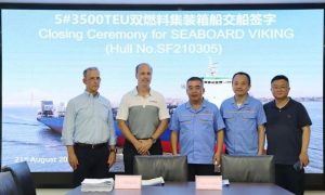8月22日,三福船舶为美国船东SEABOARD公司建造的6艘3500TEU双燃料(LNG+MGO)集装箱船系列第五艘"SEABOARD VI...